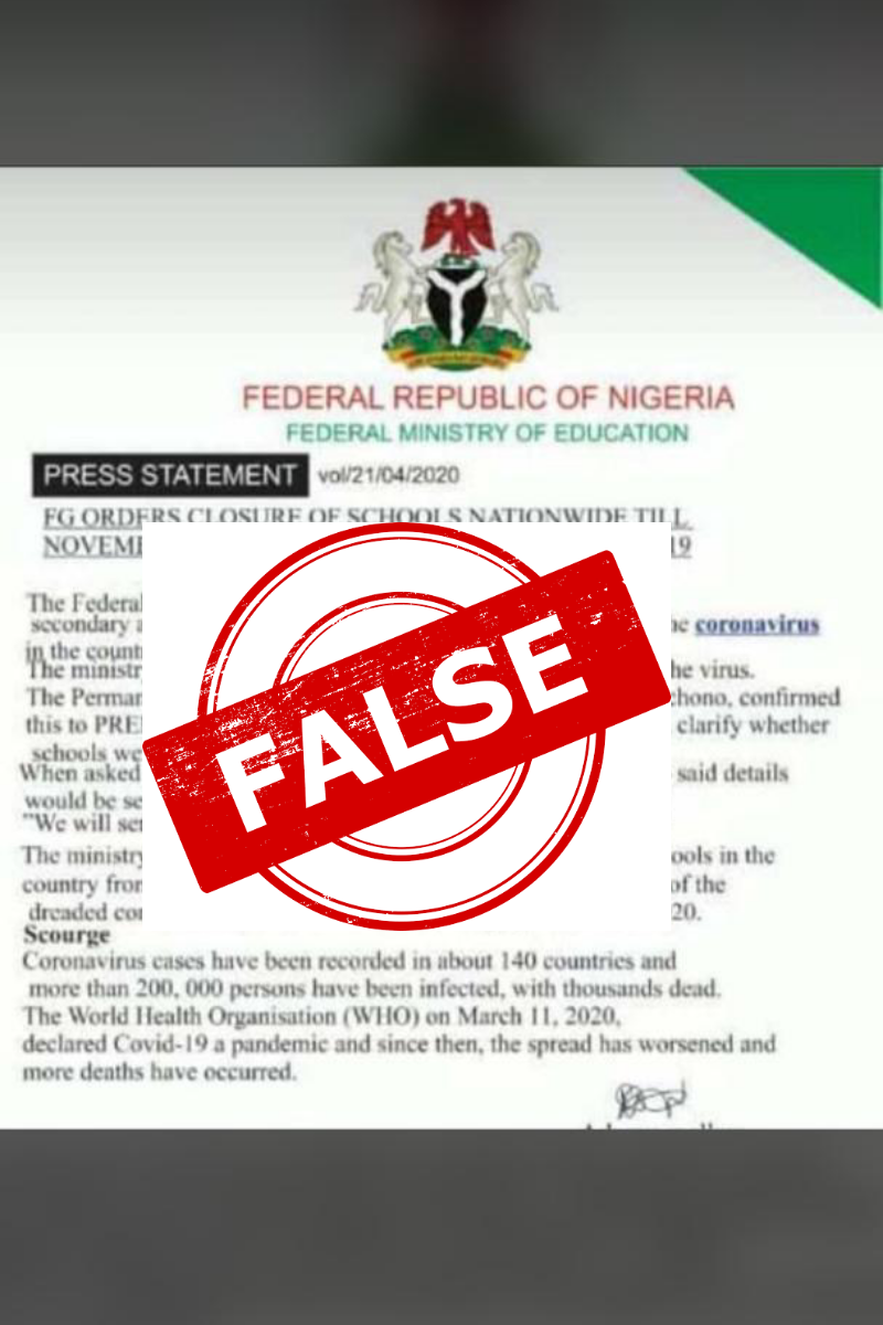 A viral press release dated April 21, 2020, which carries the name of the Federal Ministry of Education suggests that the federal government has ordered the closure of schools till November, 2020.