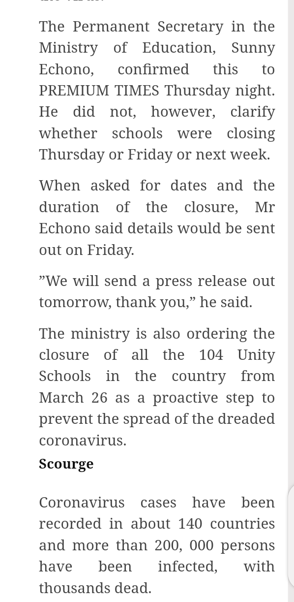 On March 19 the federal Ministry of Education ordered the closure of tertiary, secondary and primary schools nationwide through its permanent secretary in the Ministry of Education, Sunny Echono. This was reported by business day, here