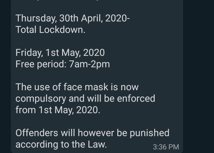 The Viral WhatsApp message suggests that the Nigeria Governors’ Forum arrived at a lockdown timetable to be followed by all states, that the compulsory use of face mask has begun in the country and it will be enforced on May 1st, 2020. It also issued a warning that defaulter will be punished according to the law.