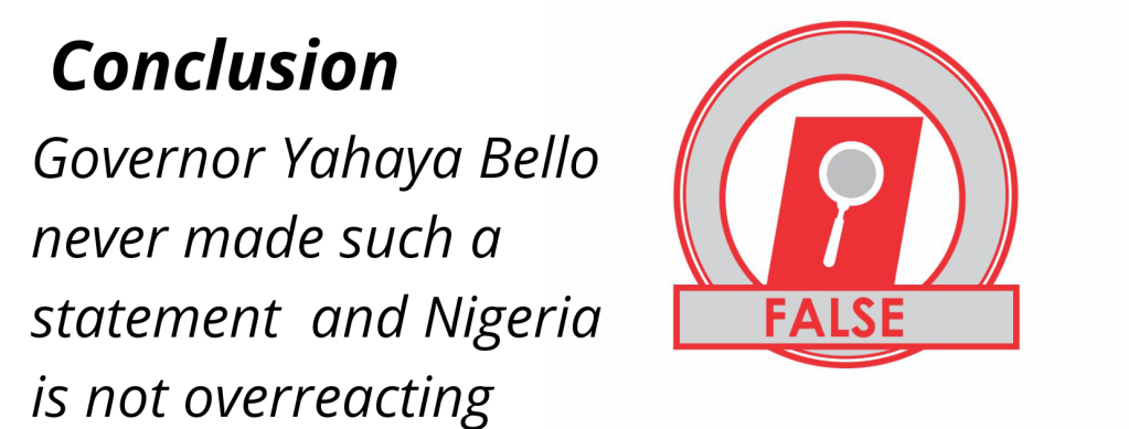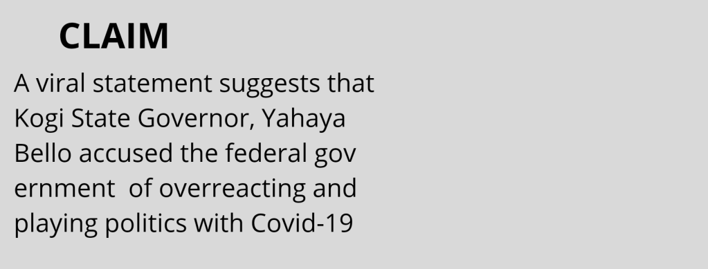 A viral WhatsApp post that has also found its way to Facebook and other blogs suggests that the Governor of Kogi State, Yahaya Bello said the federal government is playing politics with the Coronavirus and overreacting.